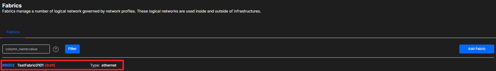 You will notice the Fabric is currently in Draft. In this state, the fabric is not available for use. Changing it to Active will make it available for use.