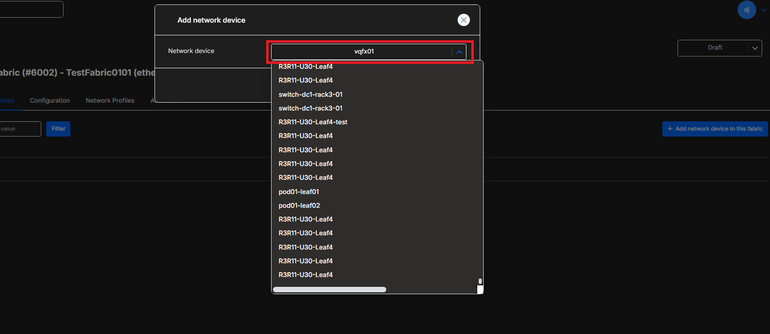 In the pop up, click on the dropdown and select the network device you wish to add to the fabric and click Add network device