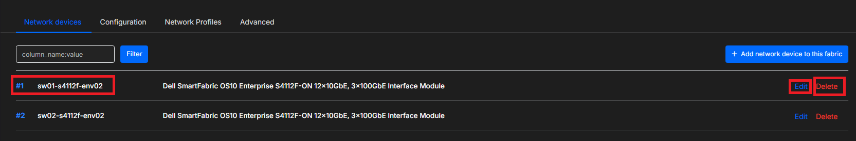 Once the network devices are added, they can be edited by clicking on the name or clicking edit (this will direct you to the specified network device). They can also be deleted from the fabric by clicking on delete