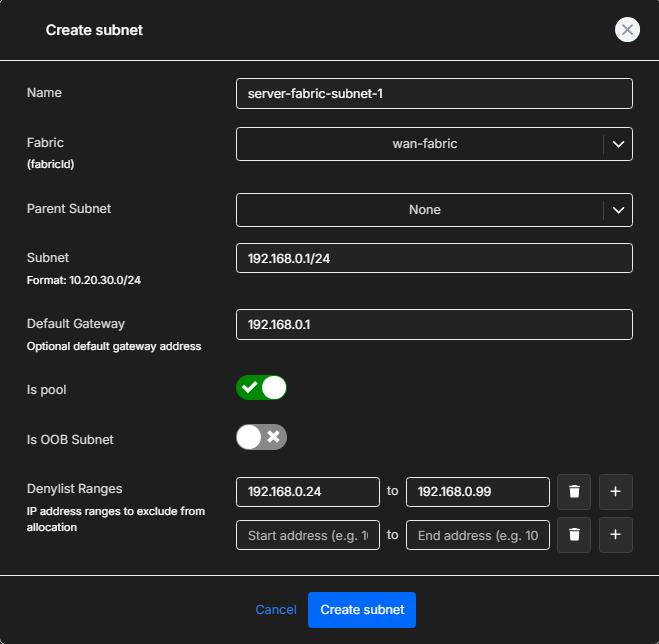 Section titled “Adding a WAN subnet”To add a WAN subnet pool go to the IPAM section of the admin UI and click on the Create Subnet button