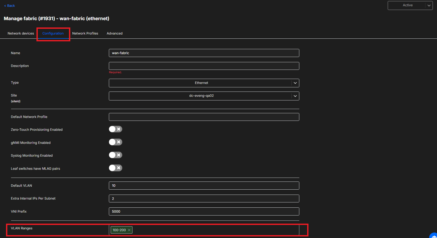 To set up a network profile, go to Fabrics, Fabric Name, Network Profiles tab. Click on Add network profile. Add a Name, Chose the Kind between vlan and vxlan. Choose whether the Allocation strategy is auto or manual. Select the Scope of the network profile (Currently only fabric available).