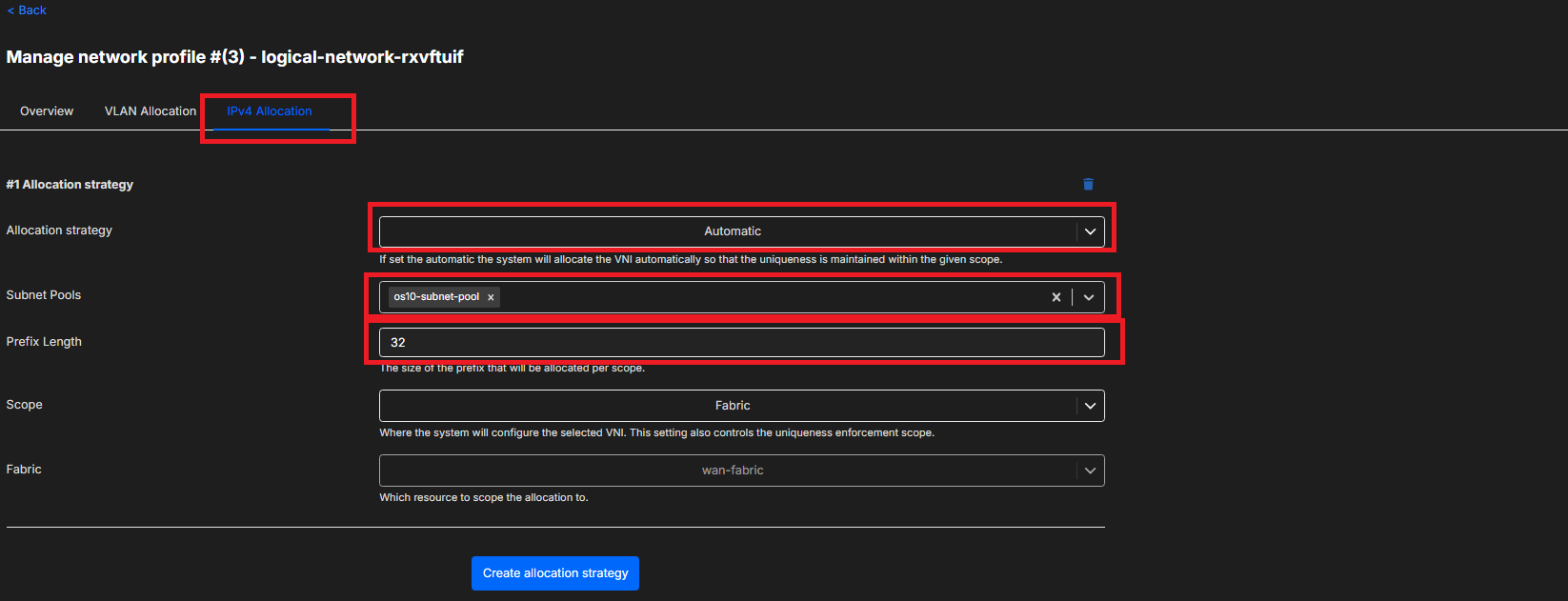 Click on the IPv4 Allocation tab to change the Allocation strategy, the Subnet Pools assigned, the Prefix length and the Scope. Changing the Allocation strategy from Automatic to Manual allows the ability to assign a specific IPv4 subnet.