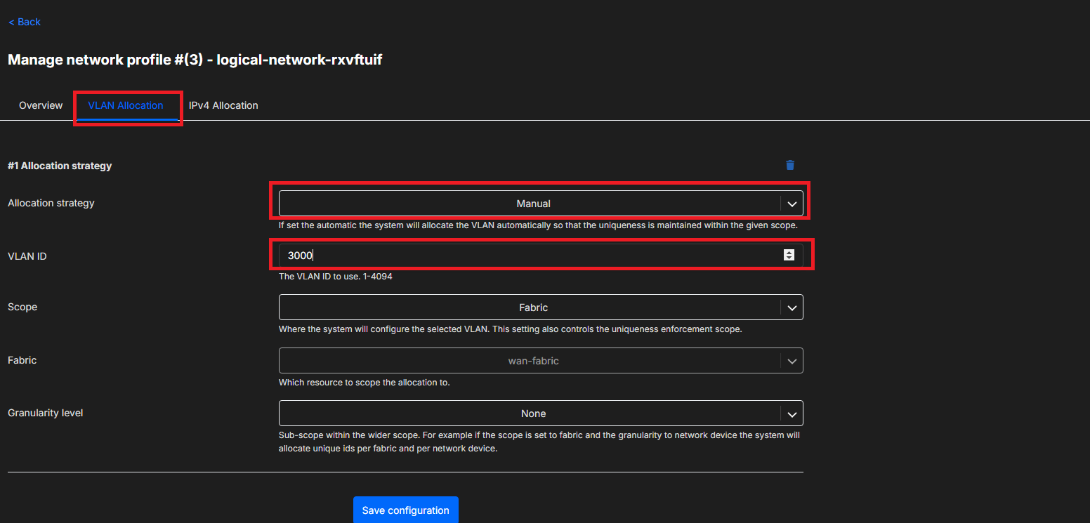 Click on the VLAN Allocation tab to changed the Allocation strategy, the Scope and the Granularity level. Changing the Allocation strategy from Automatic to Manual allows the ability to assign a specific VLAN.