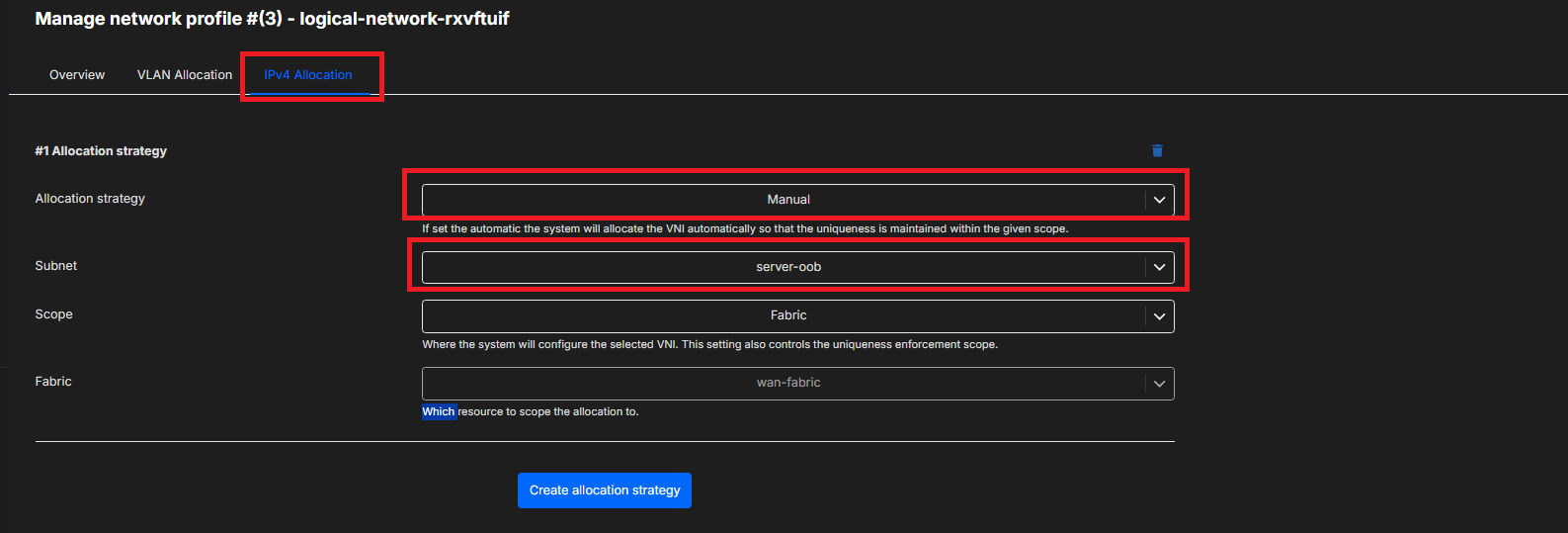 Click on the IPv4 Allocation tab to change the Allocation strategy, the Subnet Pools assigned, the Prefix length and the Scope. Changing the Allocation strategy from Automatic to Manual allows the ability to assign a specific IPv4 subnet.