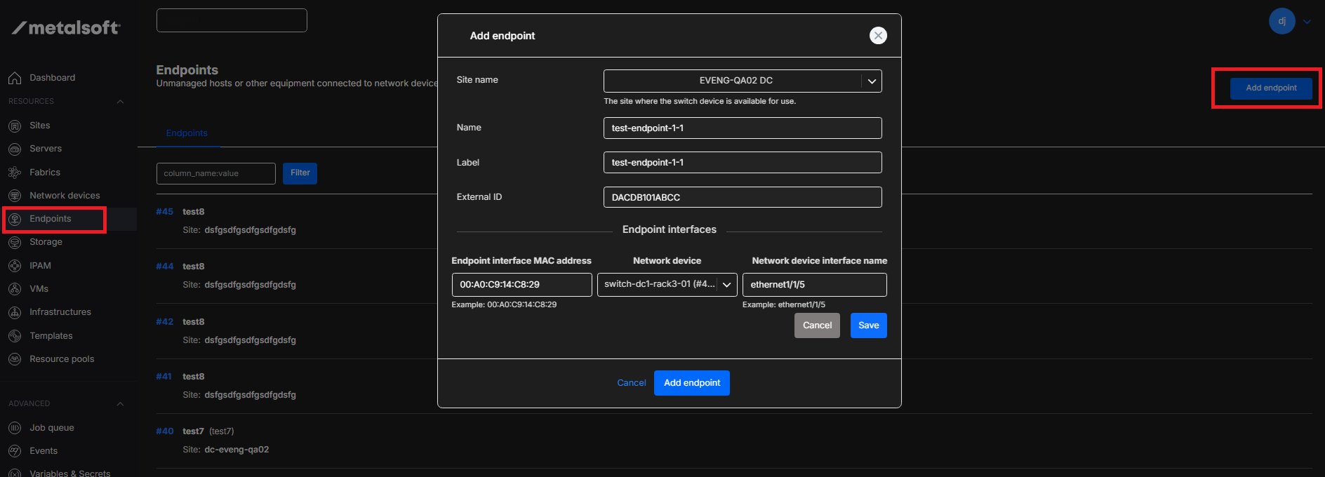 New interfaceand fill out the Endpoint MAC address, select theNetwork devicefrom the dropdown and enter thenetwork device interface nameand click onSave. Repeat to add more interfaces. A dummy, (but correct) MAC can be used if the MAC address is not important. - Click on
