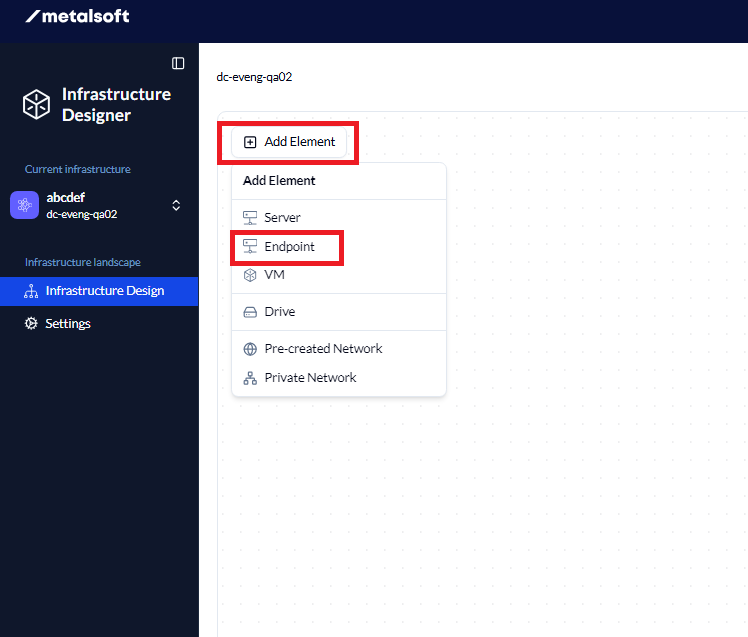 Section titled “Adding a new endpoint to an infrastructure using the UI”Open the Infrastructure Designer and click on Add Element and click on Endpoint