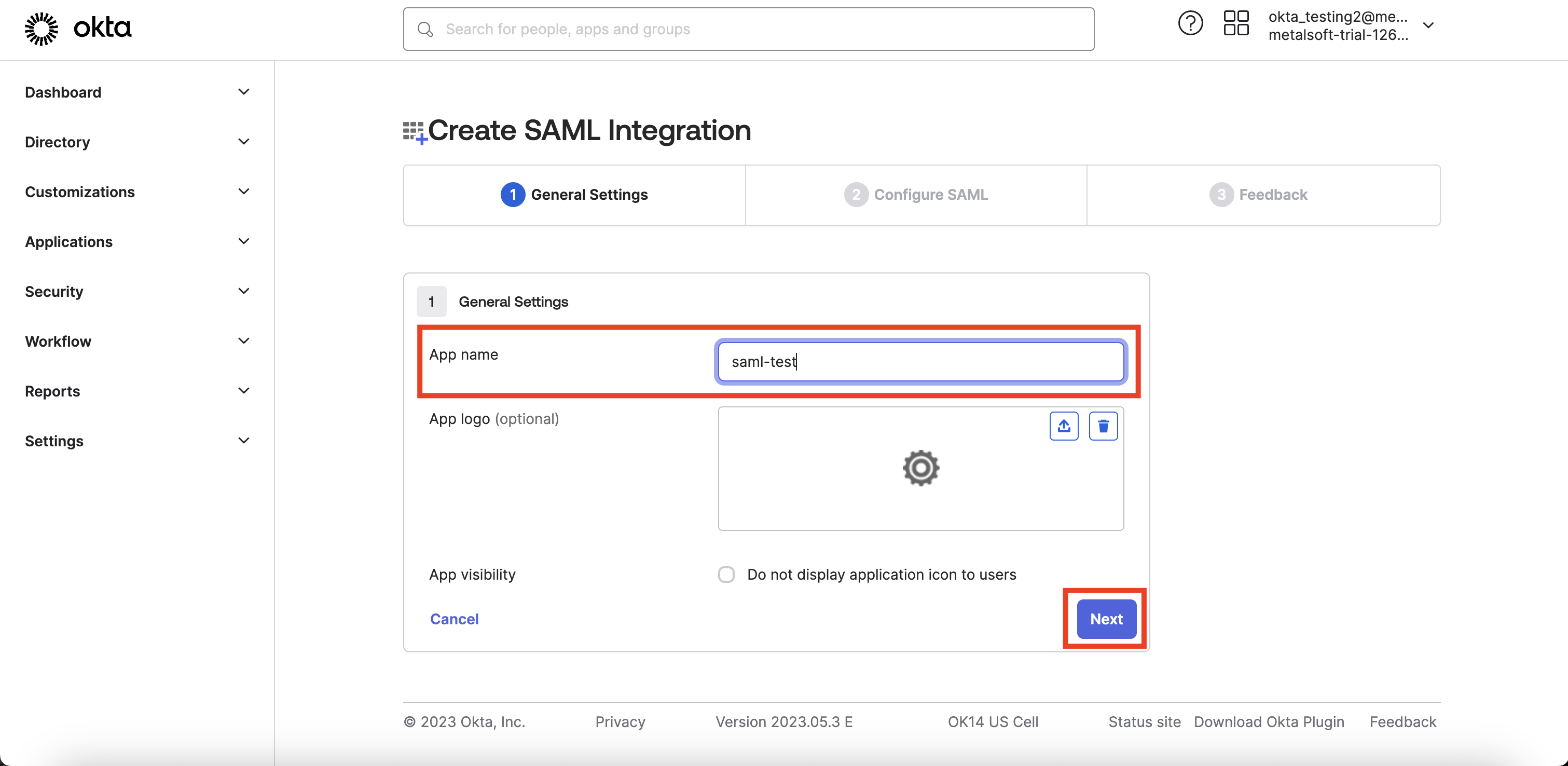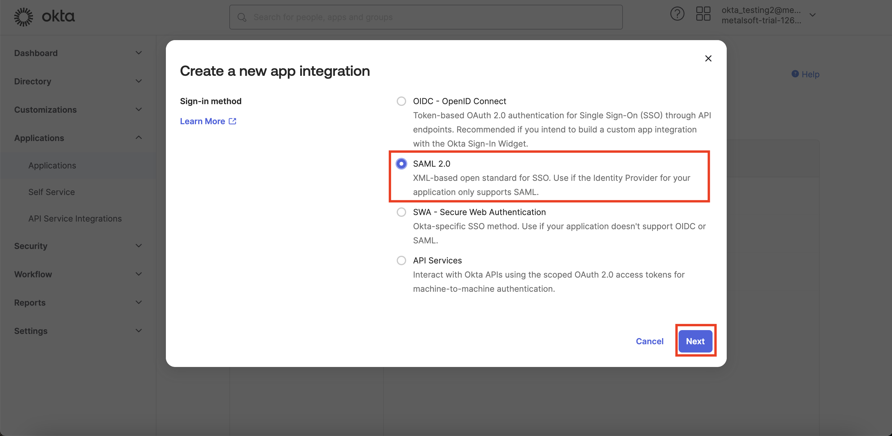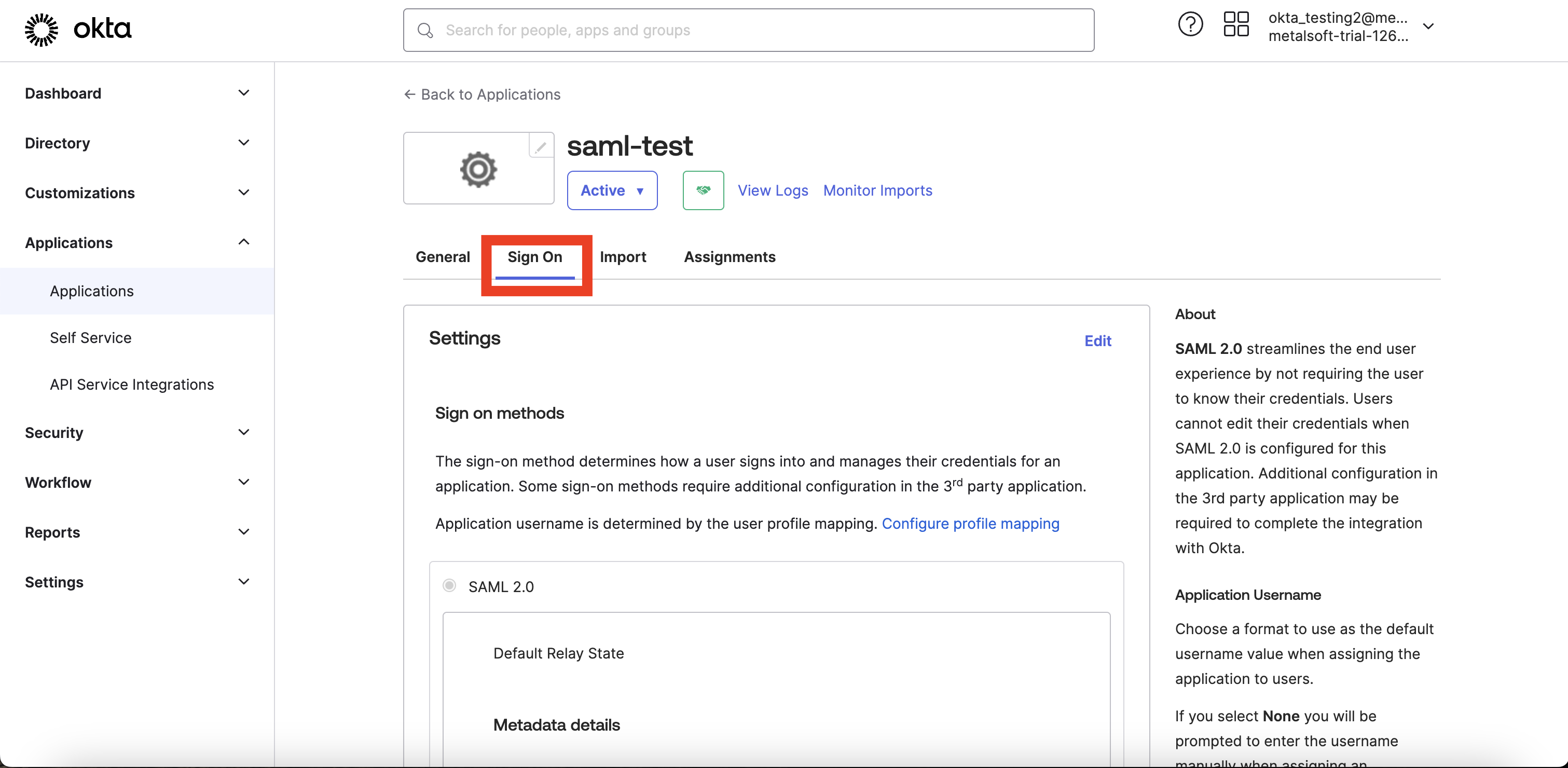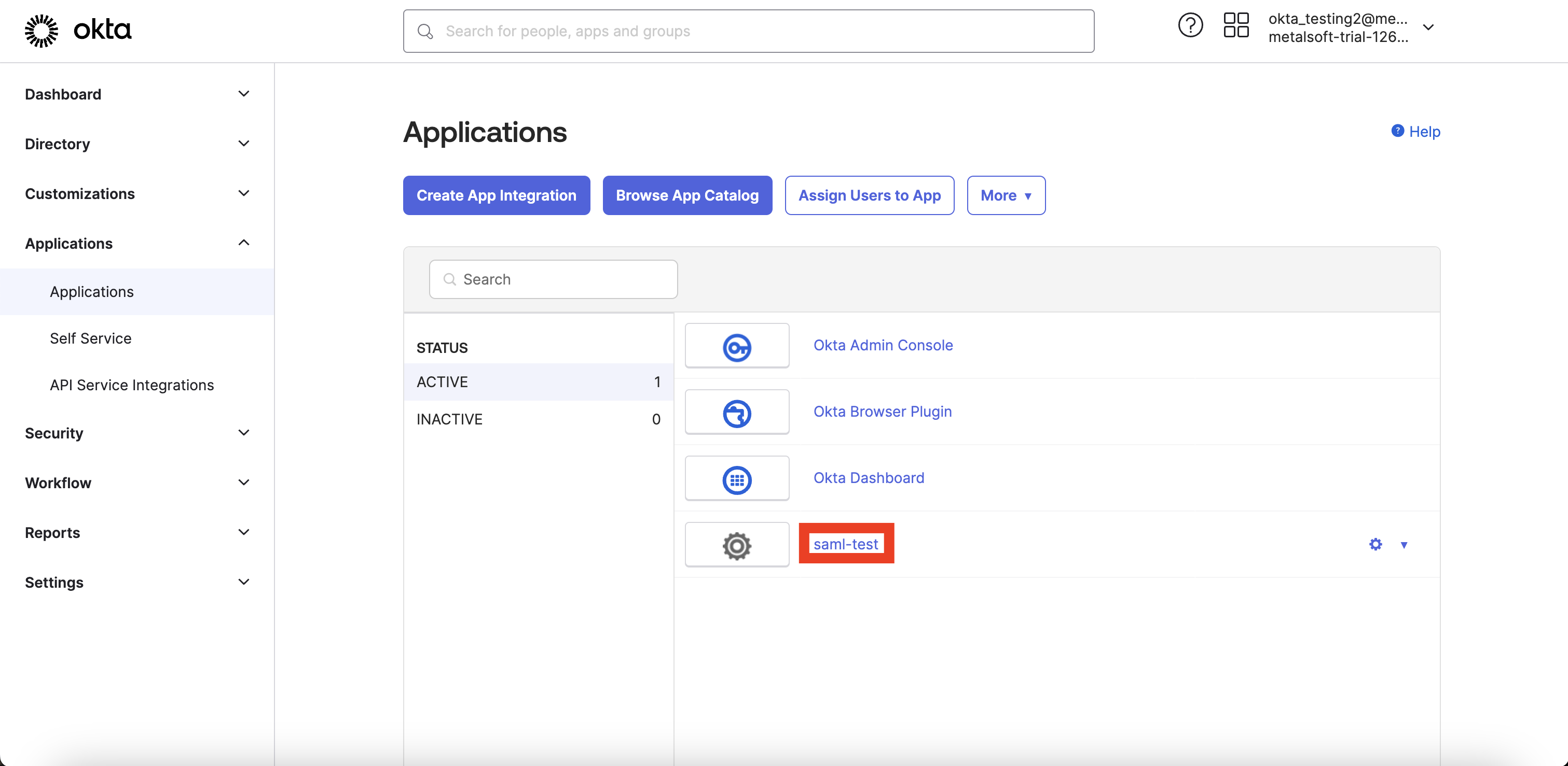Section titled “Step 2. Configuring MetalSoft App for using Okta configuration.”In step 1, we created an app named “saml-test.” For step 2, it is necessary to integrate Okta’s app with the MetalSoft app. Okta will provide the configuration data required by the MetalSoft app. Please follow the steps below: