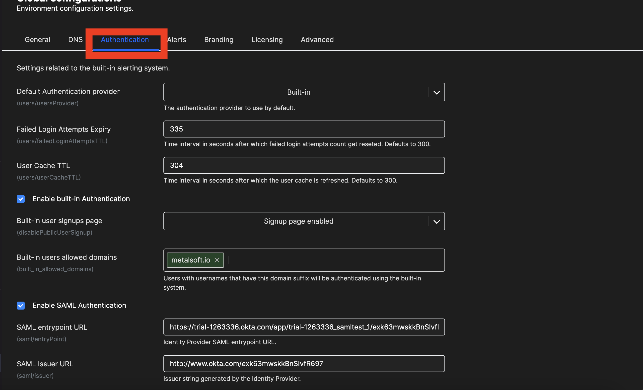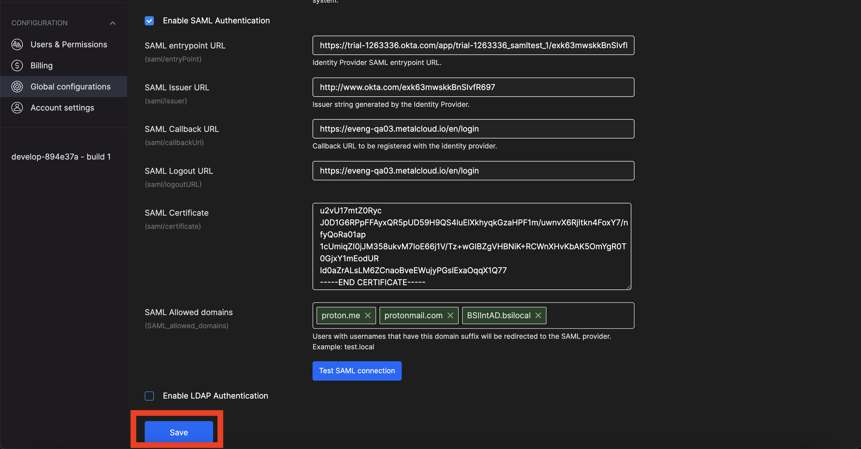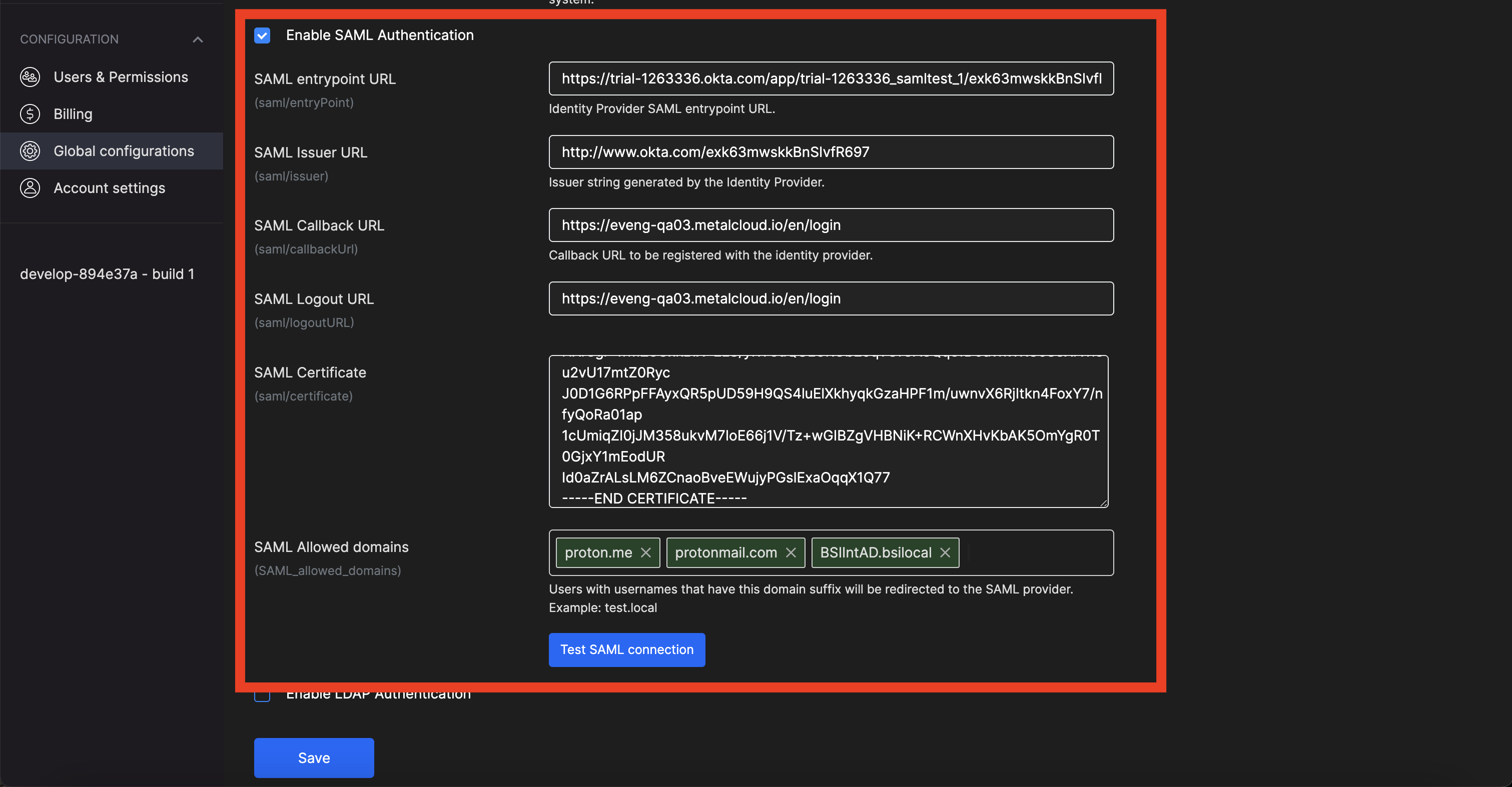 - SAML Allowed domains = The domains of email addresses that will be subjected to SAML treatment on the login page. (eg. domain.com, gmail.com)