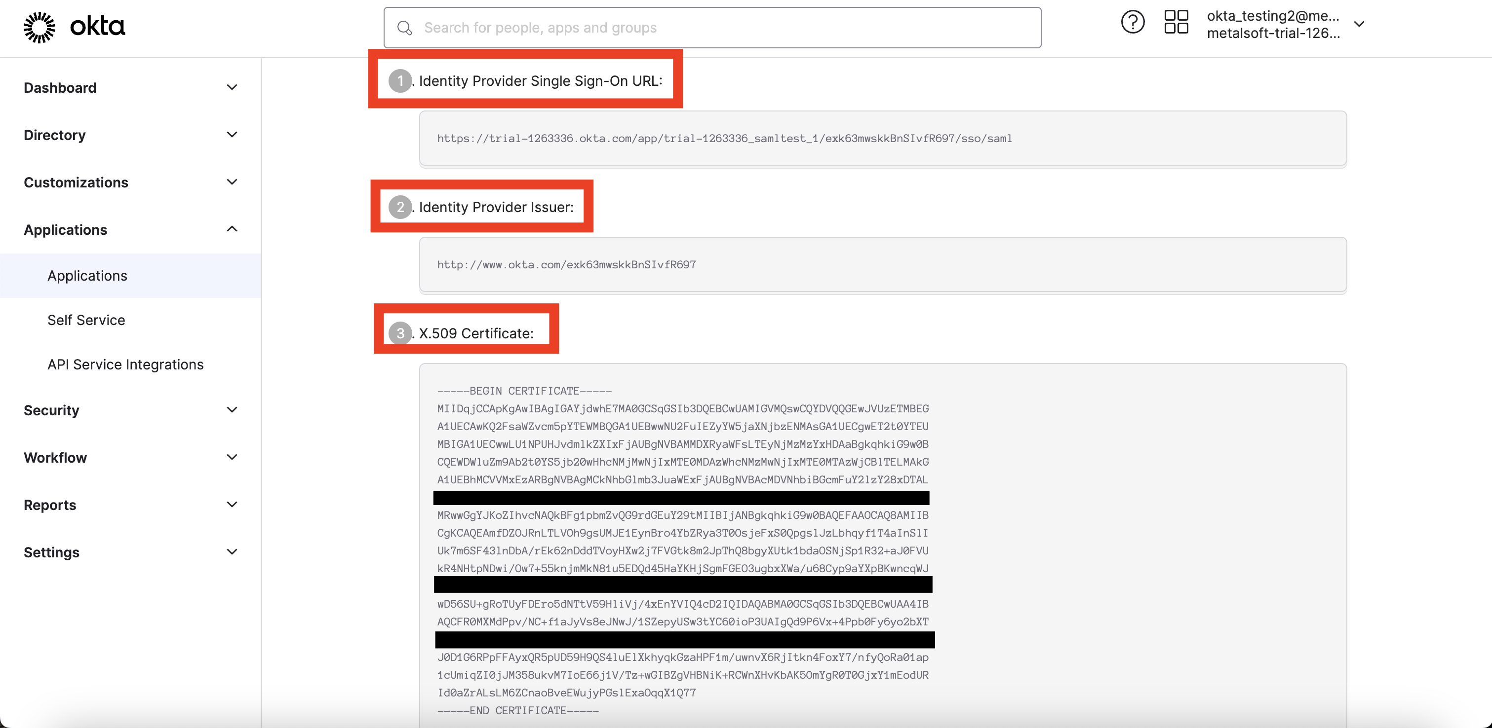 Identity Provider Single Sign-On URL, Identity Provider Issuer, X.509 Certificate will be used in the MetalSoft app.