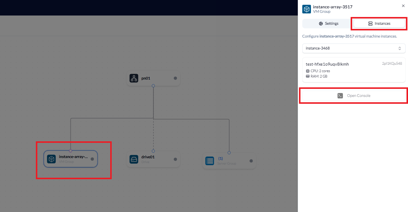 Section titled “Accessing the console of a VM”Click on the VM, click on Instances and click on Open Console