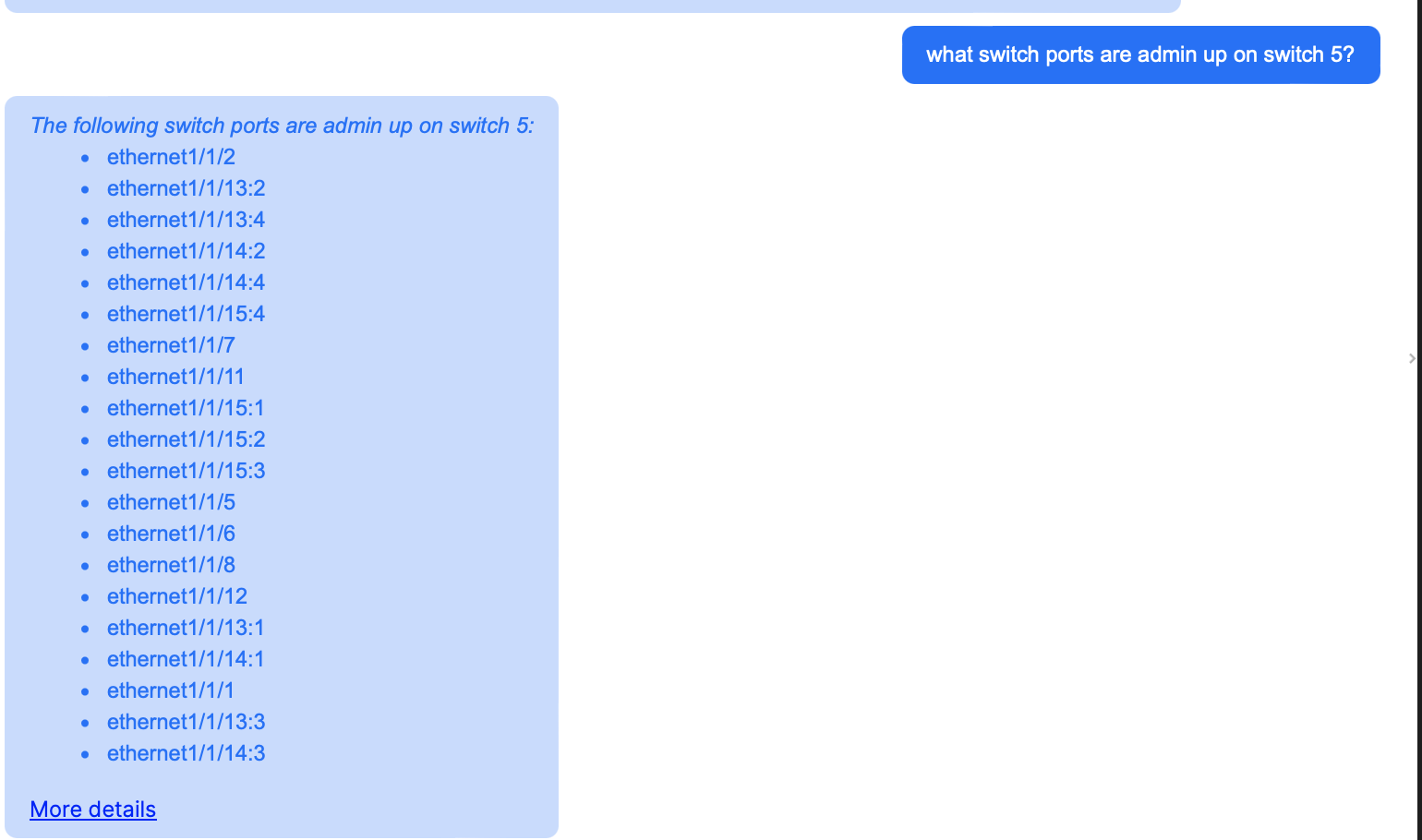 Section titled “Getting the switch ports of a switch”prompt example: what switch ports are admin up on switch 5?
