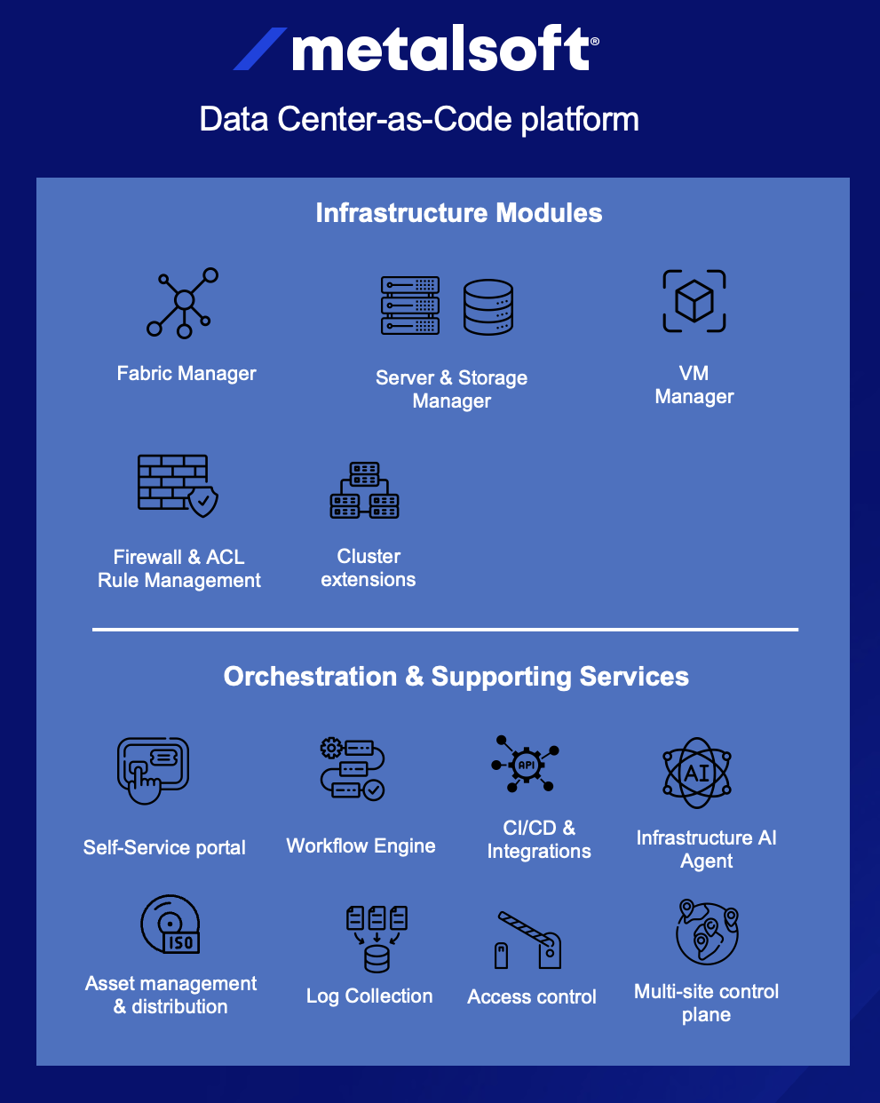 Section titled “Welcome to MetalSoft!”The MetalSoft CloudPlex Platform is a powerful Software Defined Datacenter (SDDC) platform, with various modules that can handle many different use cases. Not all modules are used at the same time by all customers. The most common use cases for the MetalSoft platform are the following: