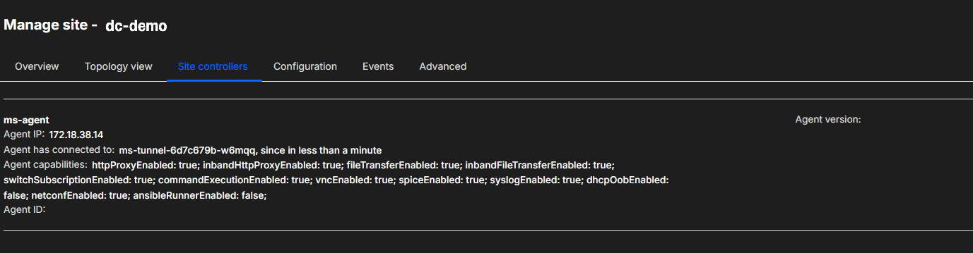 In the site details page go to the Site controllers tab and check if the agents are connected: