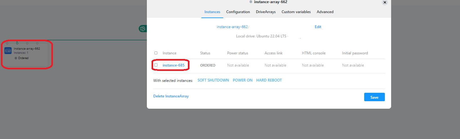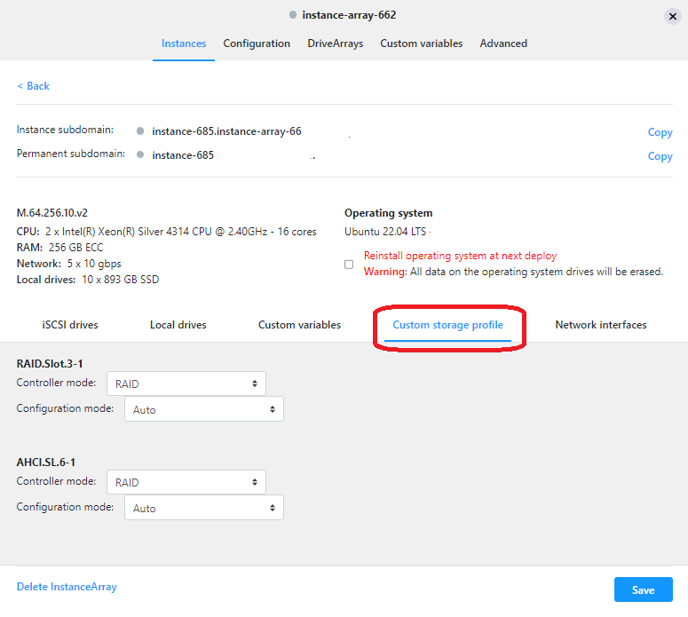 Once this has been enabled, the user will then be able to set their custom RAID configuration on any new instance ordered by clicking on the Ordered instance array, clicking on the instance ID and clicking on Custom storage profile.