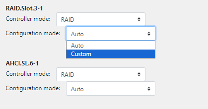 Then clicking on Controller mode to toggle between RAID and HBA (if supported by the RAID controller), and the Configuration mode by selecting Custom.