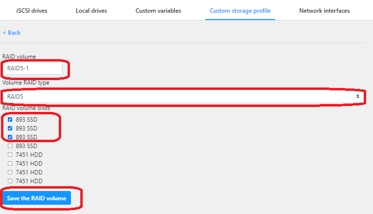 Input a name in RAID volume, select a Volume RAID type and select the RAID volume disks and click Save the RAID volume