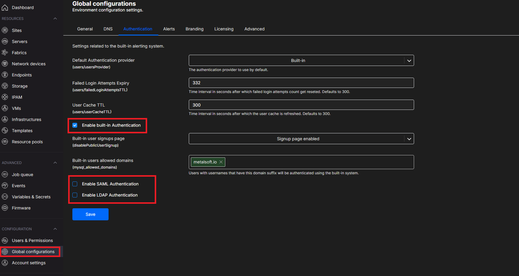 MetalSoft supports Built in, LDAP and SAML login authentication. Built in is default. To set up an alternate login authentication method: