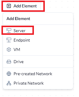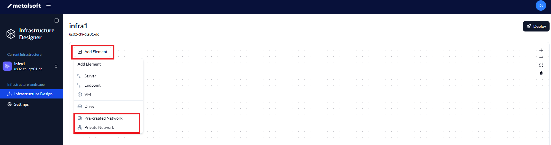 Click on “Add Element” and select “Pre-created Network” or “Private Network”. If “Pre-created Network”, then it will be added to the infrastructure.