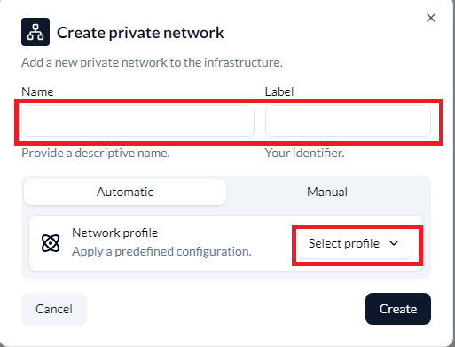 If “Private Network”, then you will need to provide a Name, a Label and the Network Profile.