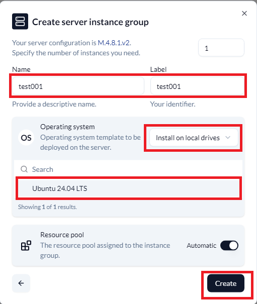 Give the server a name and label, select the drop down next to “Operating system” and select “Install on local drive” and then your operating system and click “Create”