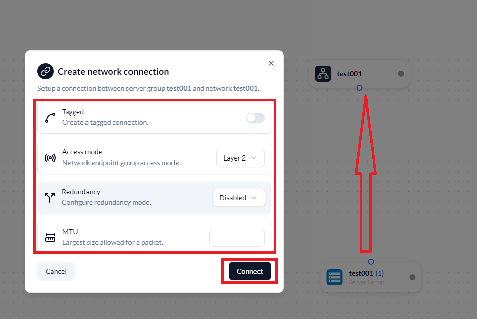 Drag the network from the server group to the network and select your network options and click “Connect”