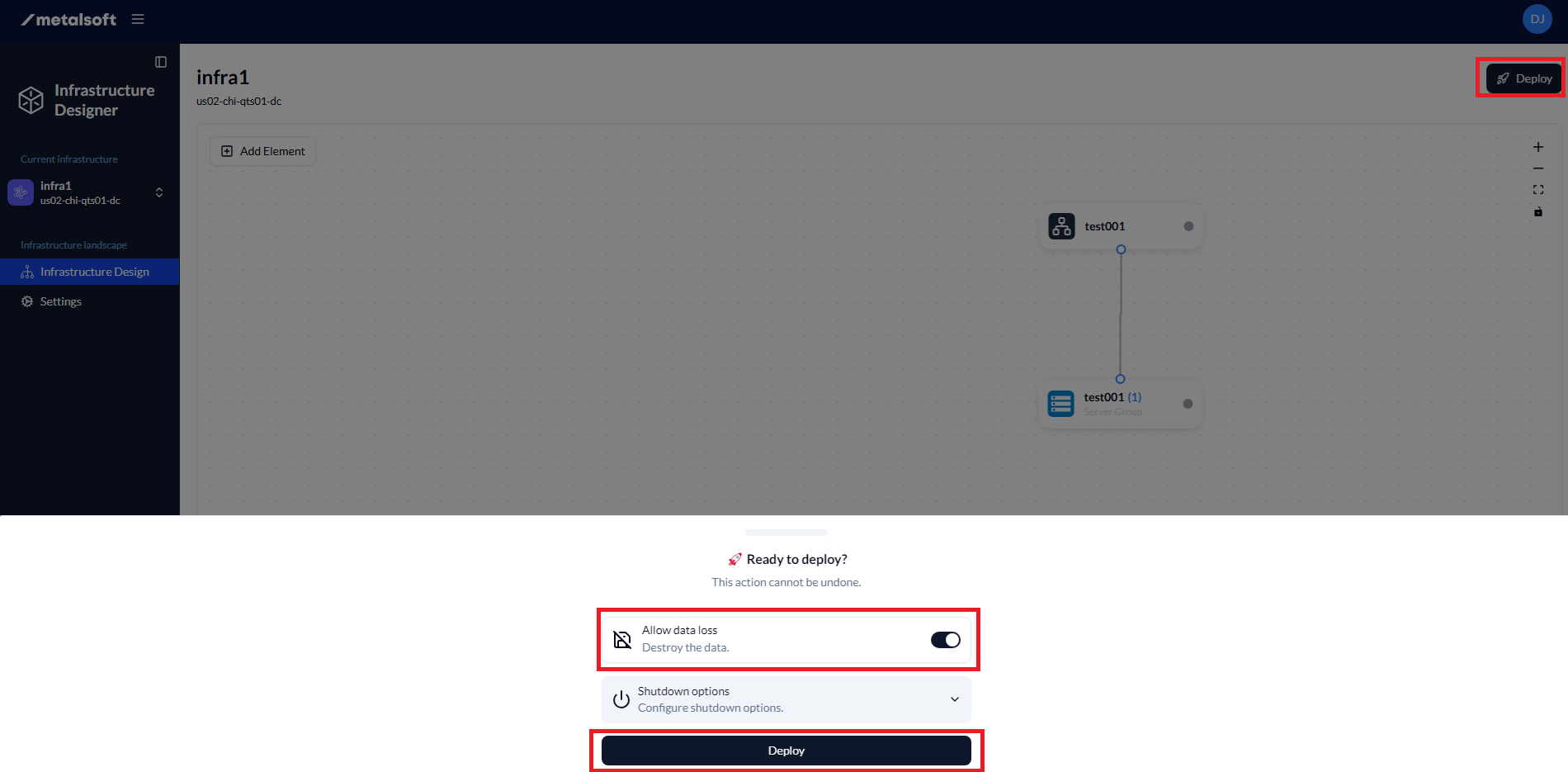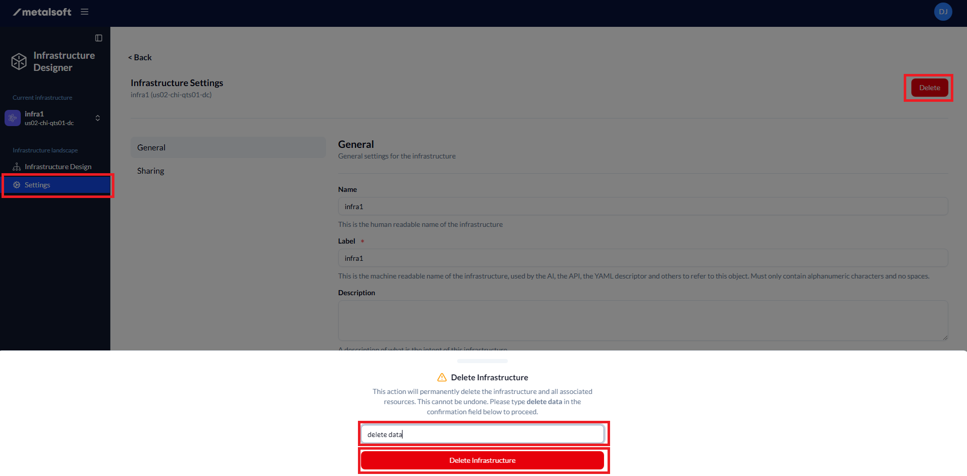 Navigate to the infrastructure designer, click on Settings on the left and click “Delete”, then type “delete data” in the pop up and click on “Delete infrastructure”