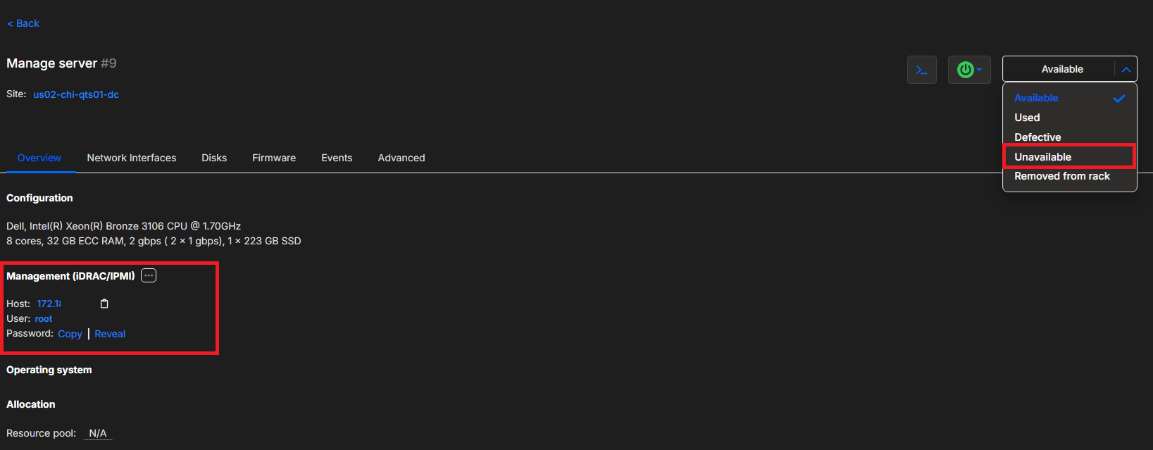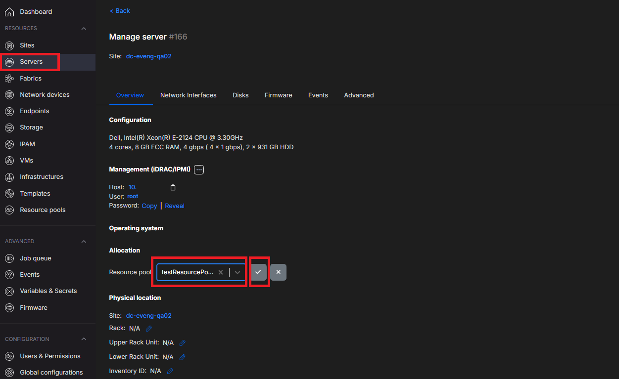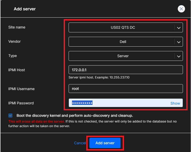 Once the server is decommissioned, navigate to Servers > Click Add server form, Select the site, vendor, type, input the IP, BMC username and password and click “Add Server”