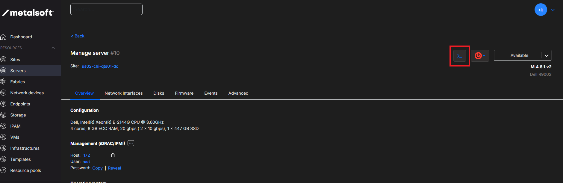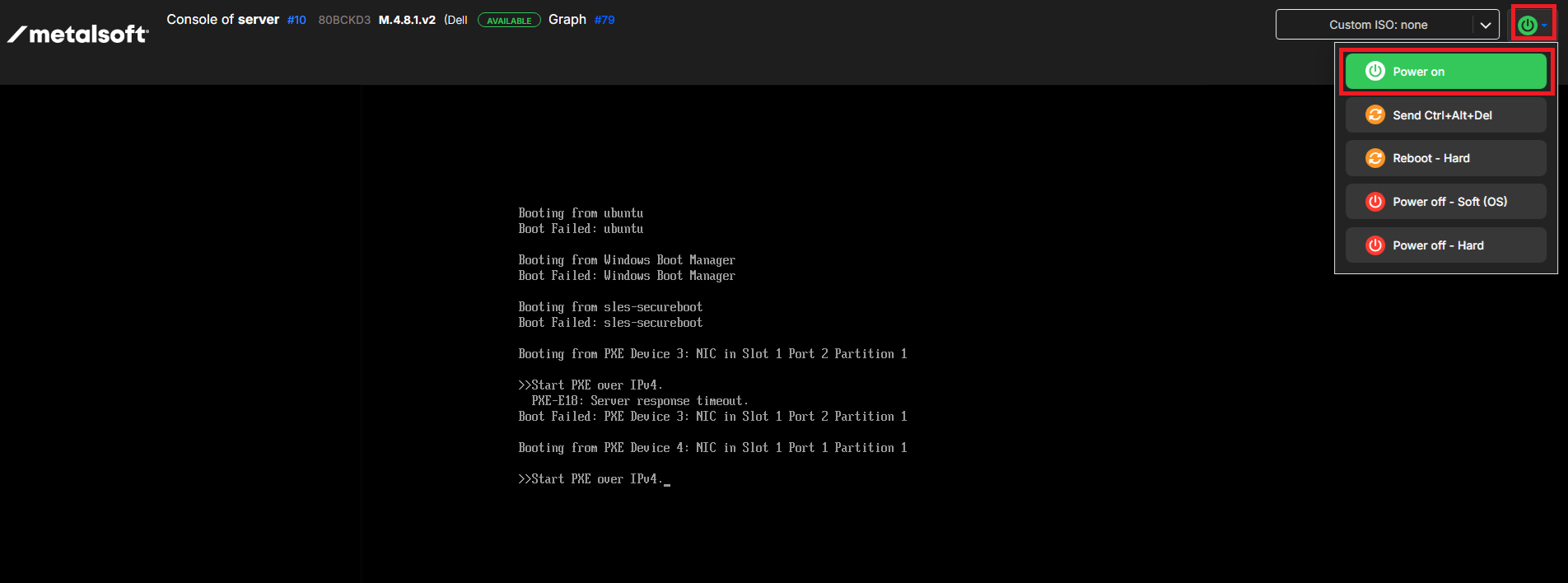 Alternatively click on the console button at the top right of the server page to check the console directly if the server hardware supports remote console and click on the power button.