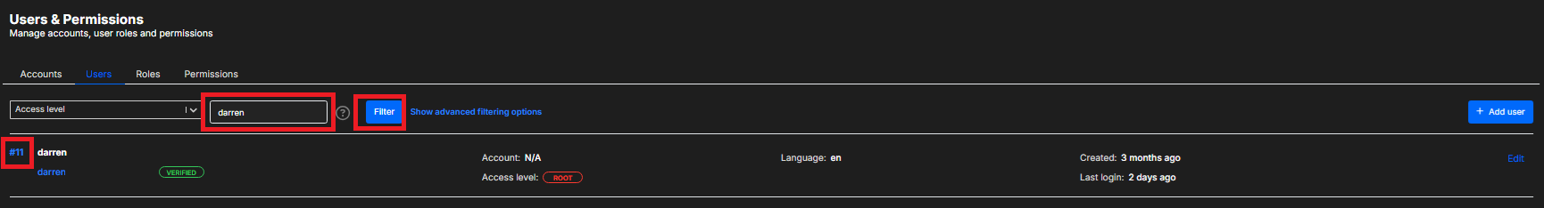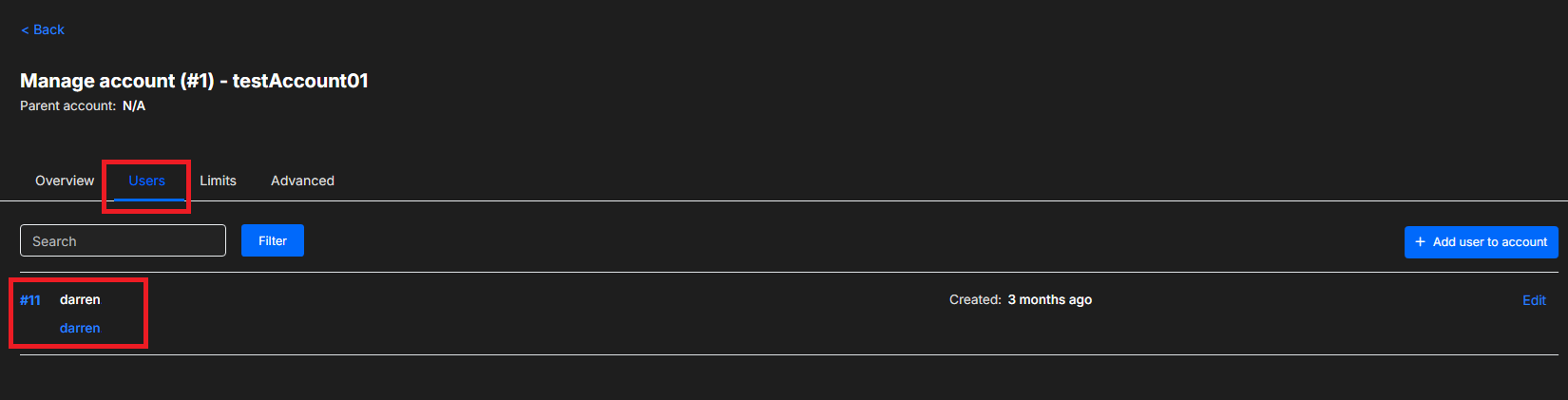 Go back to Accounts/click on the account created and click on Users and confirm the user has been added