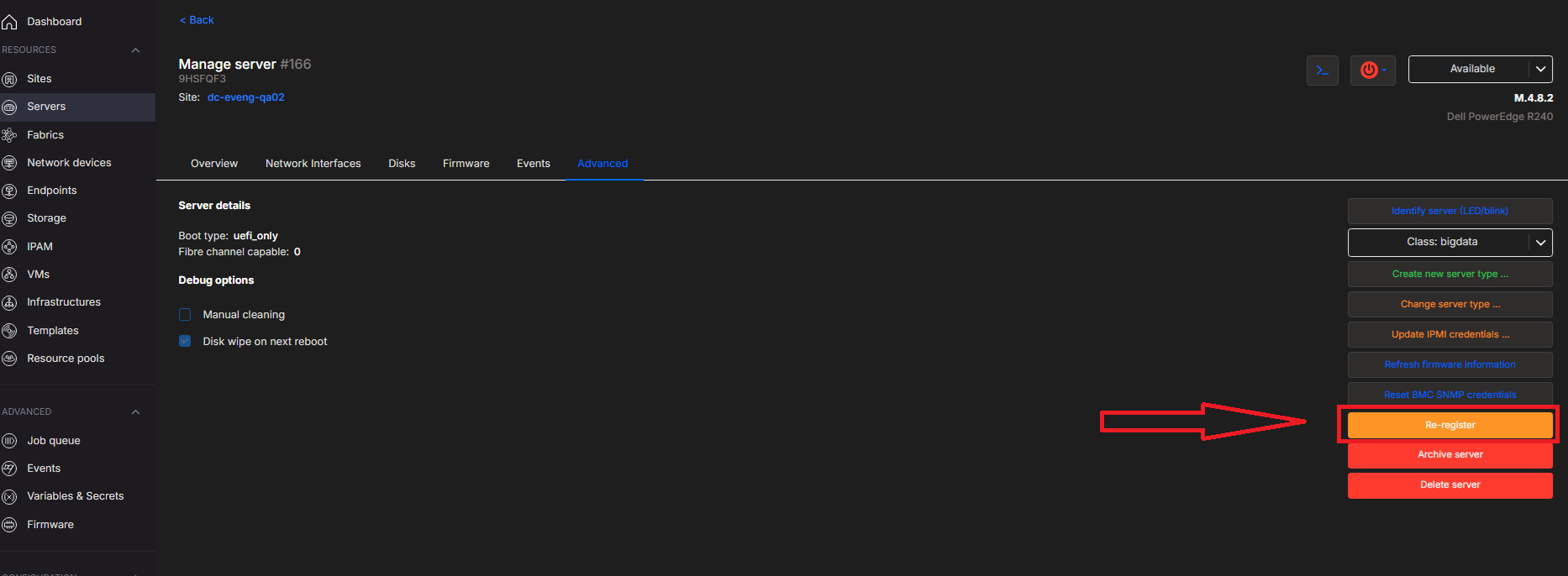 To re-register a server (to re-discover hardware information) -> Server -> Advanced -> Re-register