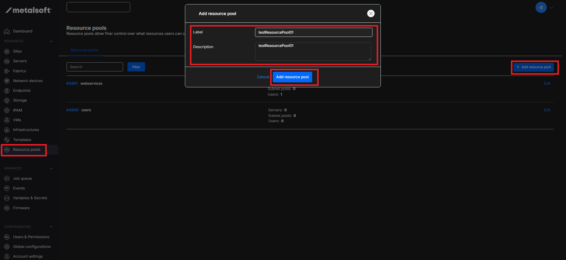 Navigate to Resource Pools and click on “Add resource pool”, fill in Label and Description and click “Add resource pool”