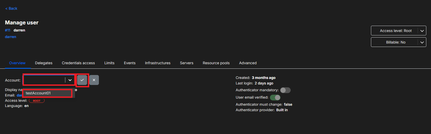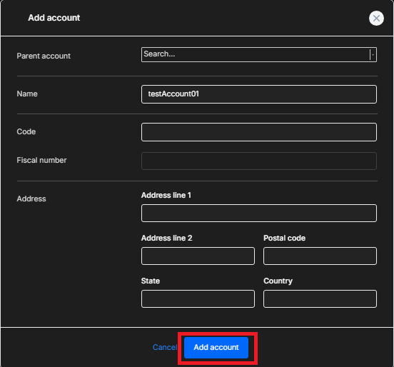 Section titled “Test 10 Create an account and add a user to the account”- Procedure