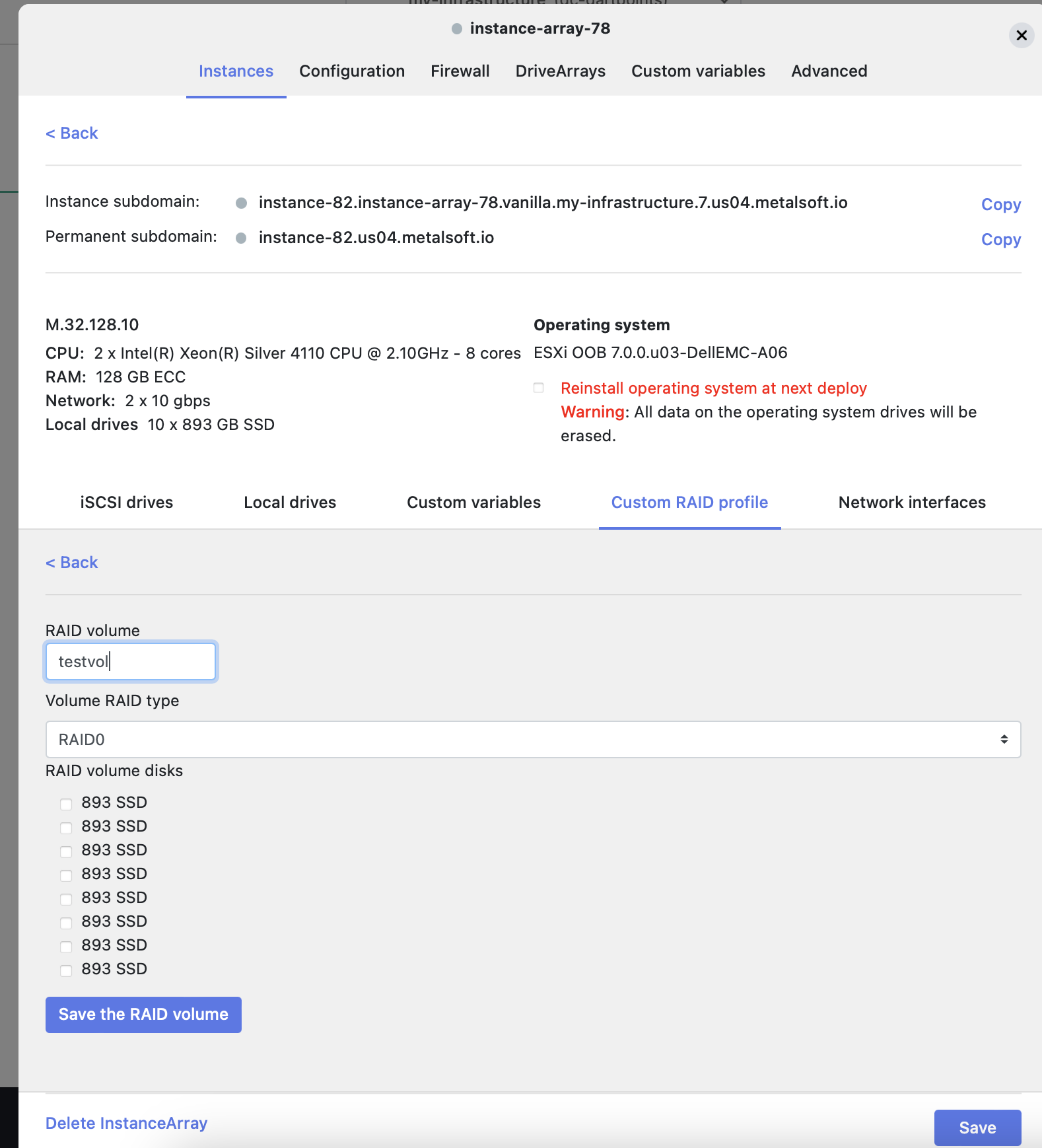 To configure a custom RAID configuration instead of the default Auto-RAID configuration go to Instance Array > Instance > Custom RAID profile.