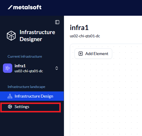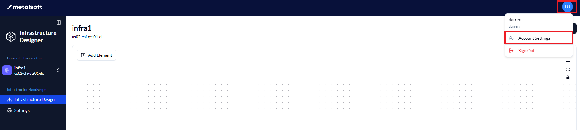 - From the infrastructure designer, click on your account name in the top right, then select Account Settings.