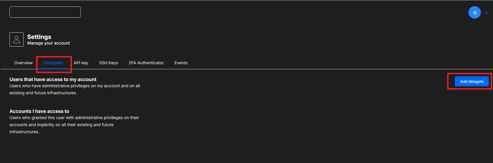 This can be done on an infrastructure by infrastructure basis or as a global action, delegating a user with administrative access over all already existing infrastructures, as well as all infrastructures that will be created in the future.