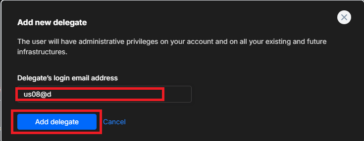 Add new delegate box, enter the login email address of the user whom you want to grant administrative privileges to and clickAdd delegate. Users who don’t already have an account will have one created for them automatically, and an activation email will be sent to the provided address.