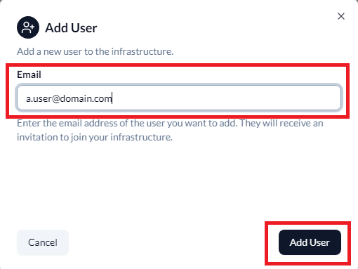 3.Click on Add User and enter the login email address of the user whom you want to grant administrative privileges to, then click on Add User.