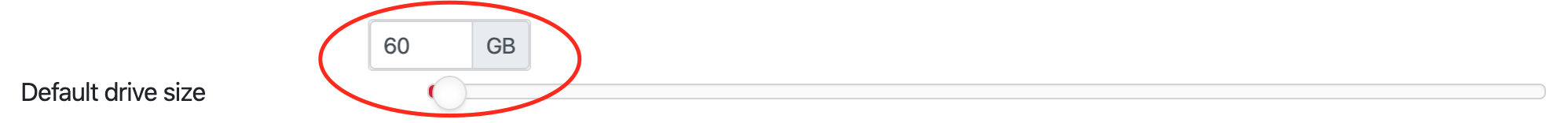 2.Drag the Default drive size slider in order to increase its capacity, or simply type the desired size in GB. It is not possible to reduce the size of a drive, since this is a very risky operation on most operating systems.
