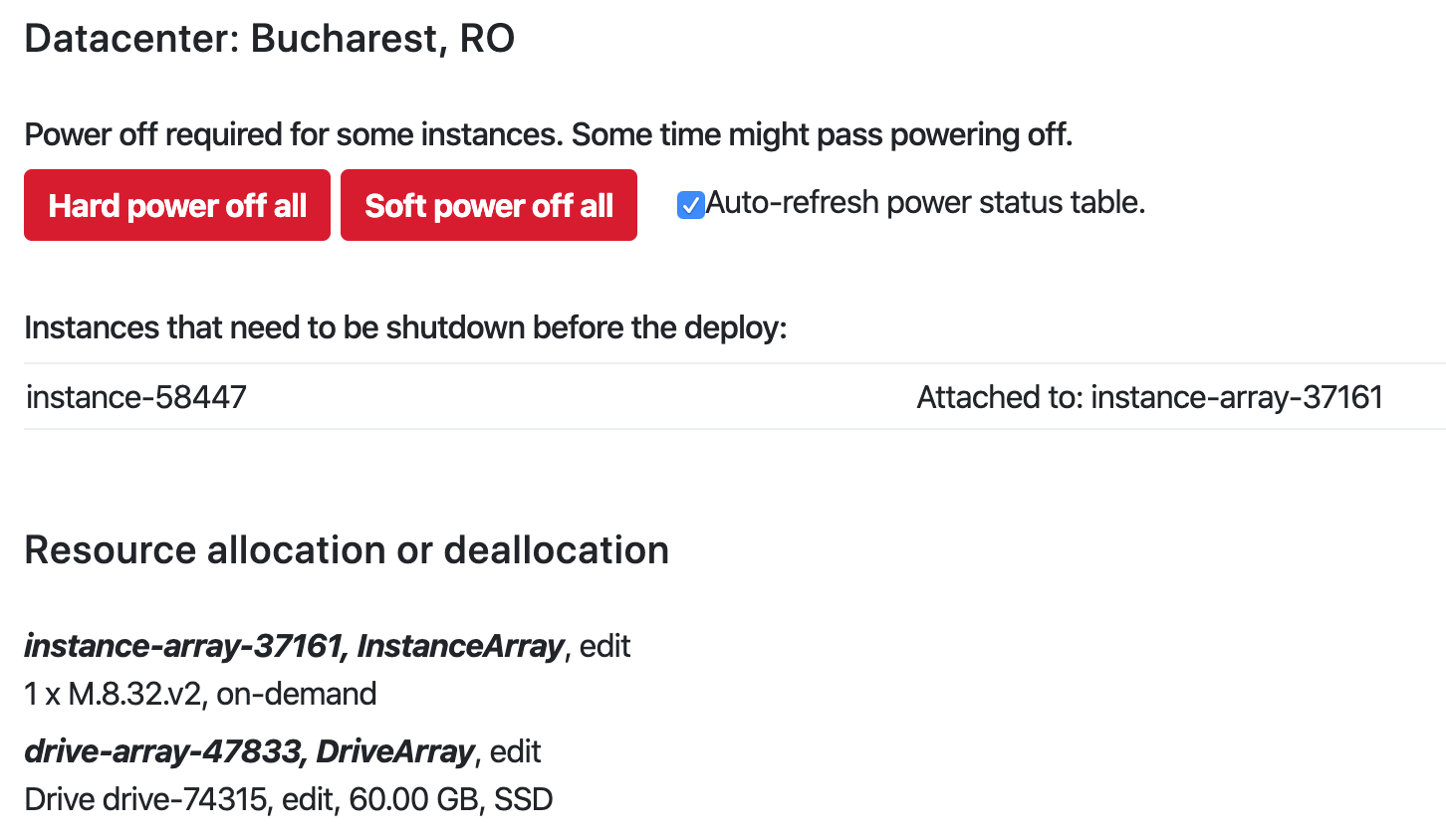 4.Resizing a disk requires that the server is powered off. If any affected servers in the infrastructure are still powered on, you will be prompted to Hard power off or Soft power off them before the deploy. We recommend the Soft power off option.