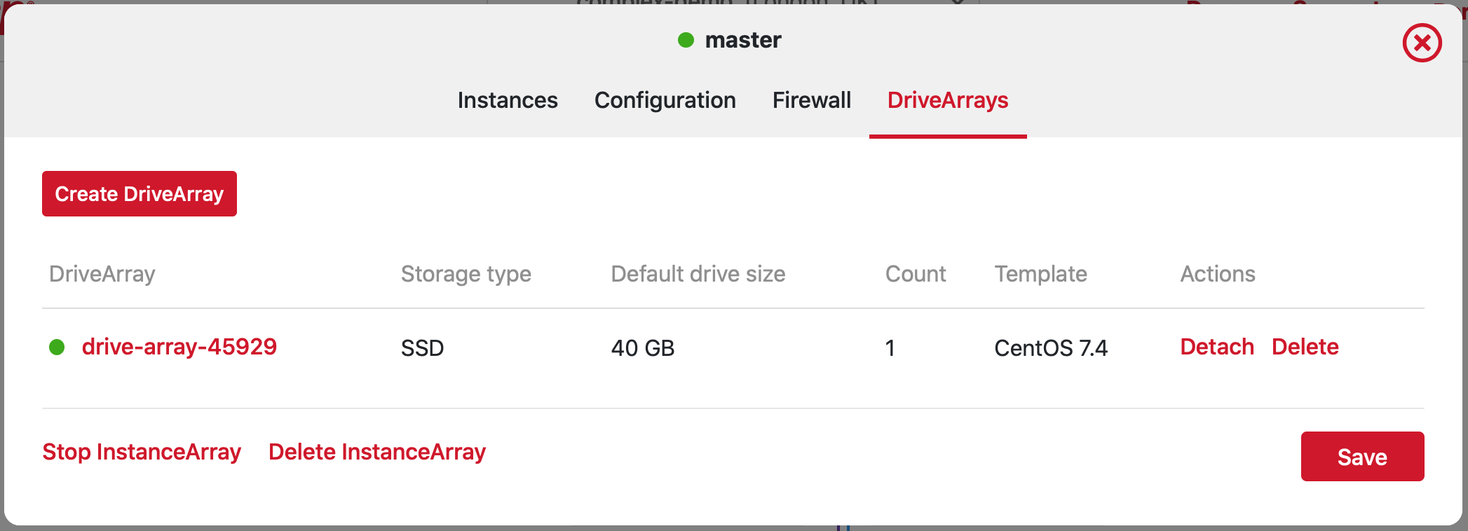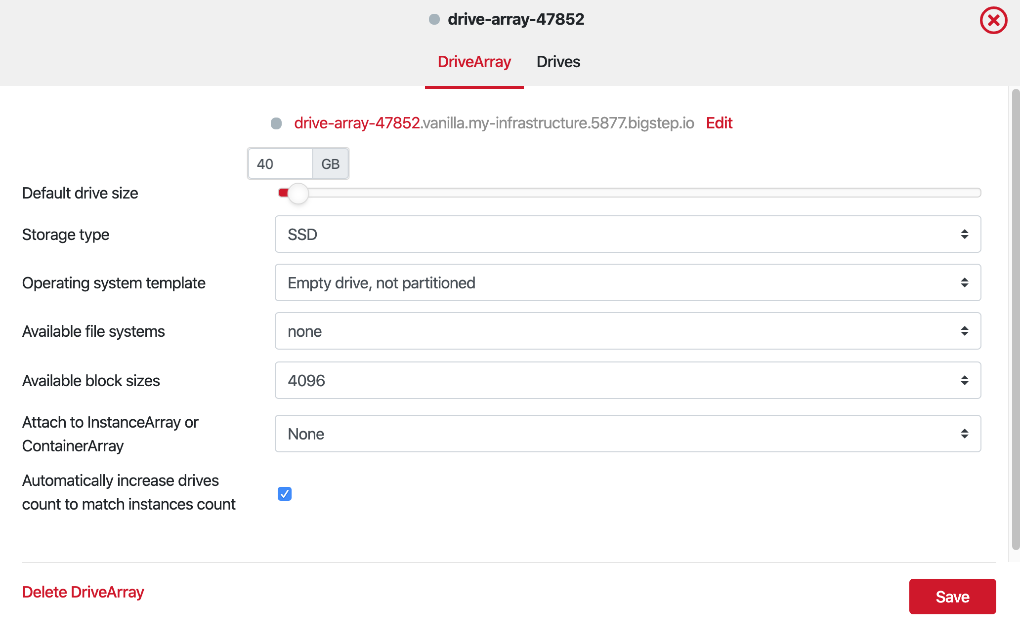 3. Click on the new Drive Array, in order to customize it. You can tweak the size, storage type, operating system template, file system and block size, as well as attach it to an existing Instance Array or Container Array. You can also attach it to an array by simply dragging and dropping it in the interface.