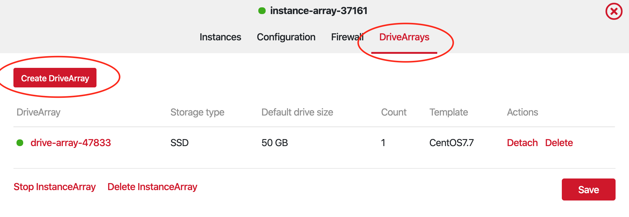 4. An alternative way to create a Drive Array is from the Instance Array overview, in the DriveArrays tab. Click on Create DriveArray and a new one will be attached to the server, with default settings. You can customize the Drive Array by clicking on its icon in the interface.