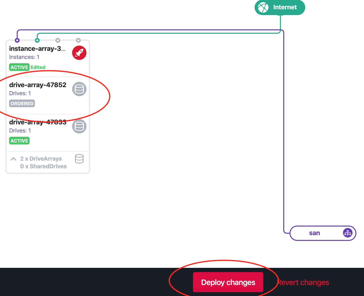 Section titled “Creating a drive array using the CLI”metalcloud-cli drive-array create --ia gold --infra complex-demo --size 100000 --label daIn order for a drive array to be accessible you need to push the Deploy changes button in the UI, or run the following metalcloud-cli command: