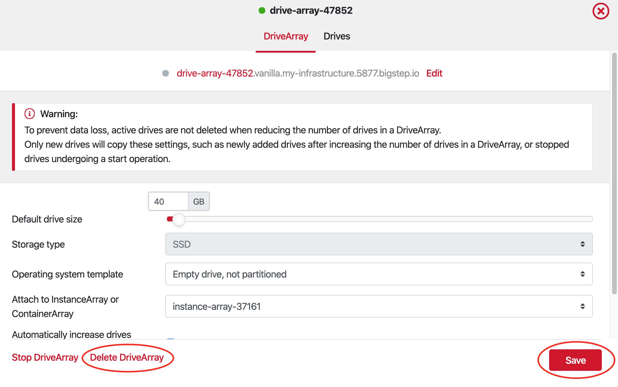 Section titled “Expanding disk size”1.From the infrastructure designer, click on the DriveArray you want to change the Drive size of. This opens the DriveArray overview panel.