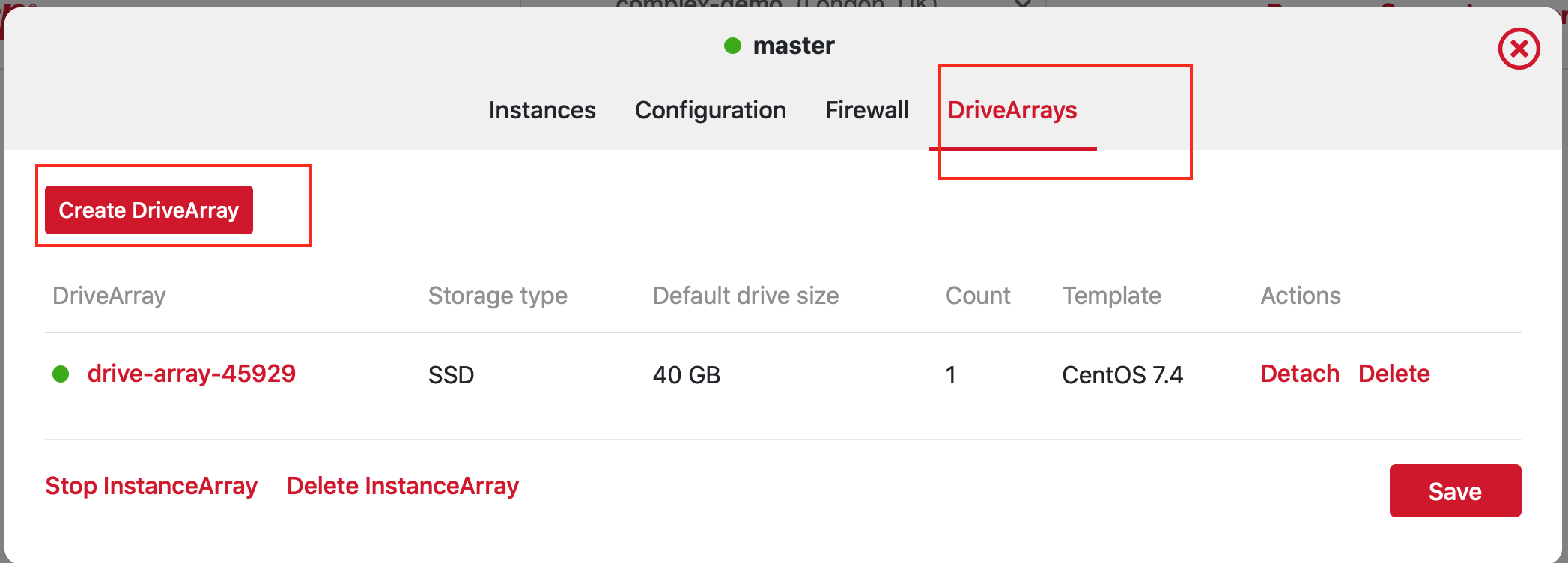 Section titled “Listing drive arrays of an instance array using the UI”- Click on on an instance array and go to the DriveArrays tab